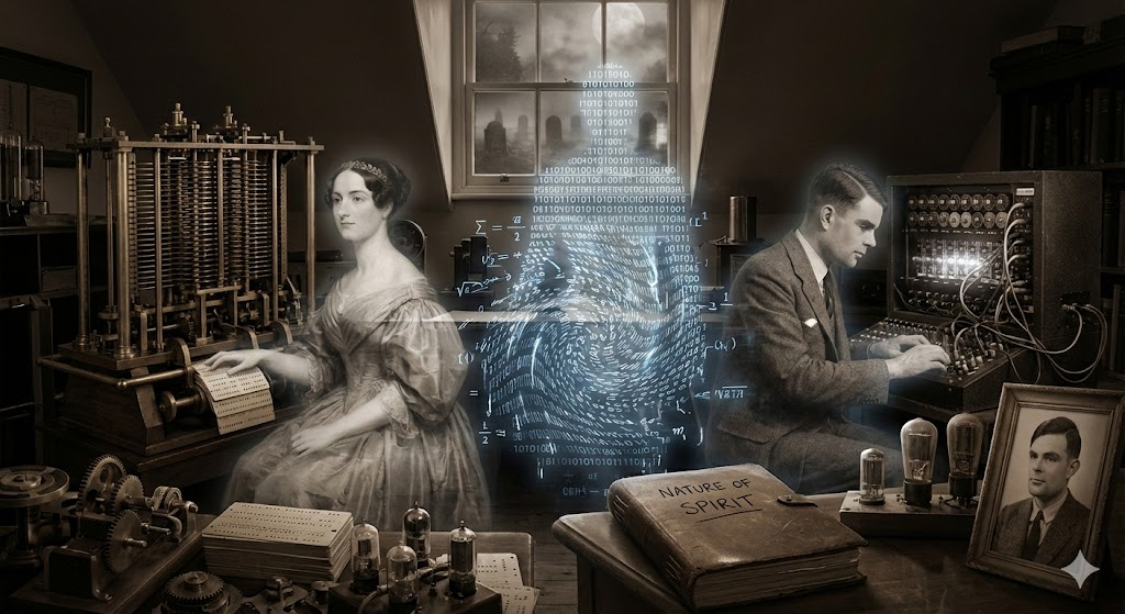 En su ensayo privado Nature of Spirit, Alan llevó este duelo al límite. Usó la mecánica cuántica, entonces una ciencia nueva y misteriosa, para buscar una laguna legal en la muerte. Imaginó que el cuerpo no es más que un receptor, una «máquina» que sintoniza la conciencia. Si la radio se rompe, la señal sigue ahí. Su lógica, nacida del dolor, fue implacable: si el espíritu es independiente de la materia, y yo construyo una «máquina universal» lo suficientemente compleja, ¿podría invocar de nuevo esa señal? ¿Podría construir una casa nueva para la mente de mi amigo?